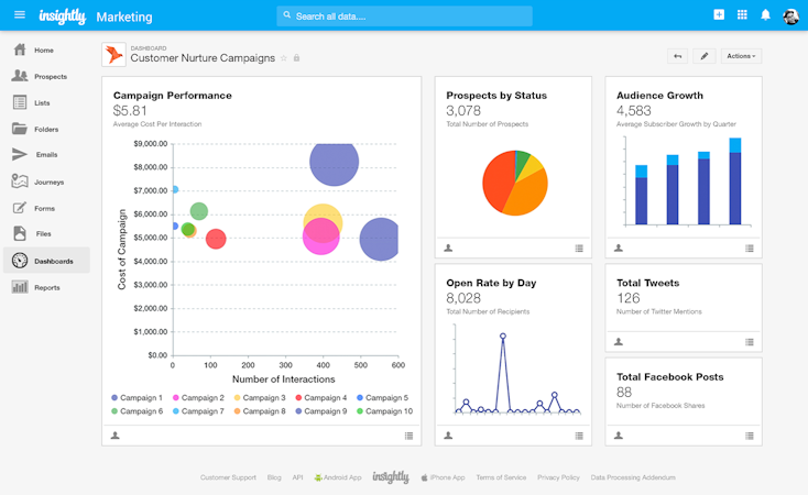 Insightly Marketing is a marketing automation software that helps businesses streamline operations related to lead capture, customer segmentation, web traffic analytics, and customer journey configuration, among other processes. It enables marketing professionals to create and embed custom lead capture and feedback forms into business websites and landing pages.