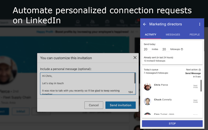 1. LinkedIn auto connect and mass messaging - Define a sequence of personalized connection requests and messages. Set up a flexible schedule for your automated messages and follow-ups.