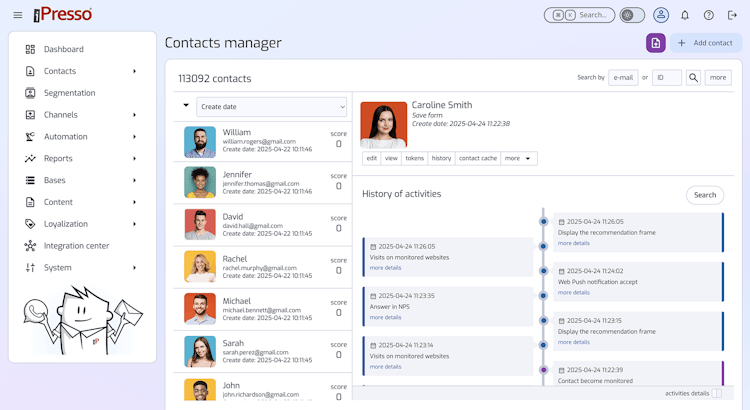 iPresso allows users to manage their contact database, with detailed contact data, customizable fields, activity tracking, contact timelines, relationship definition, and external data integration. Advanced segmentation tools enable the definition of highly specific segments using inclusion and exclusion rules, with the ability to save, use, and perform mass actions on segments, and also the power to ‘freeze’ any segment to prevent updates. Other features offered by iPresso include customer scoring, data collection, real-time marketing, content automation, outcome measurement, opinion polls, loyalty programs, and more.