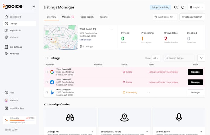 Jooice is cloud-based and AI-enabled digital platform that helps optimize business profiles and listings, manage customer interactions and reviews, streamline online presence, and more. It provides strategic recommendations against competitors and automatically drafts responses to customer reviews.