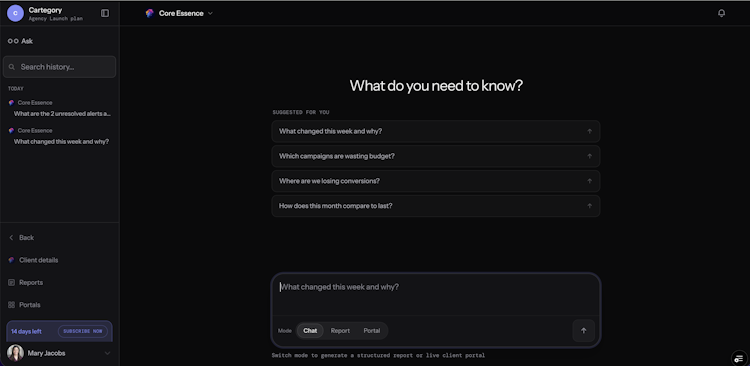 Report generation capabilities allow formatted, client-ready performance reports to be produced through simple text prompts. The output includes executive summaries, campaign breakdowns, performance metrics, and AI-generated recommendations without manual data manipulation. White-label branding features enable agencies to customize reports and client portals with their own logos, color schemes, and custom domains. Scheduled reporting functionality enables users to configure automated interval summaries that are generated, formatted, and distributed according to specified schedules. Every insight cites specific data sources by displaying the exact metrics, date ranges, and data segments used to generate each conclusion.