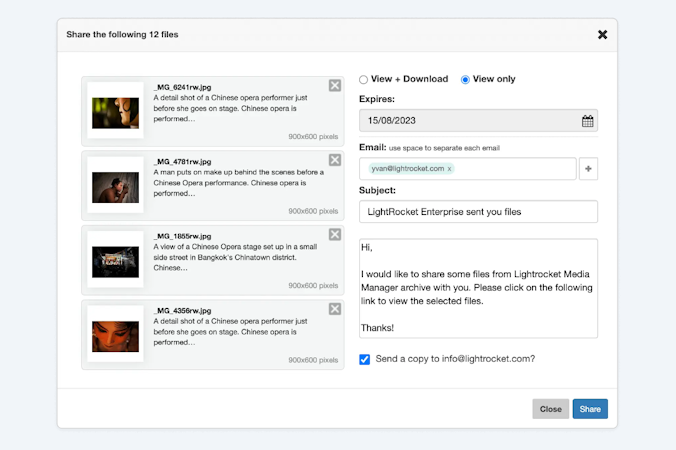 LightRocket Enterprise is a digital asset management (DAM) system that helps organizations securely store, organize, locate, and share digital media assets. The software provides a centralized platform so teams and clients can easily access files from anywhere around the globe. AI tags and laser-accurate search functionality ensure users can find files quickly.