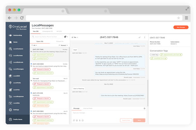 Text messaging is considered the most engaging method of communication with customers, and it can be done right from the LocalMessages dashboard. LocalMessages has a high degree of engagement that allows customers to text you when it’s convenient for them. That way, you can respond to customer inquiries faster and win more business.