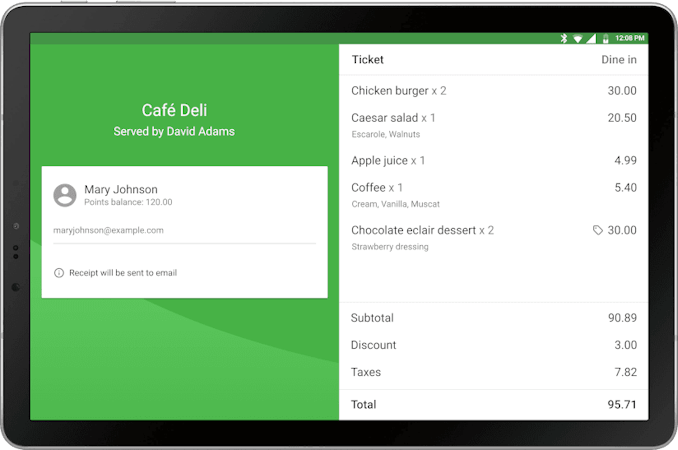 The CDS is easily connected to the POS via a WiFi router, so no wires are needed. It immediately displays the information that the cashier adding to the ticket items with modifiers, discounts, taxes, and more. Loyalty points are also shown for regular customers. At the end purchase, CDS shows the summary of receipt, together with paid amount and change.
