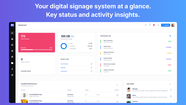 • Launch and update content instantly.: Users can publish changes in seconds and ensure all connected screens stay up to date without manual intervention.