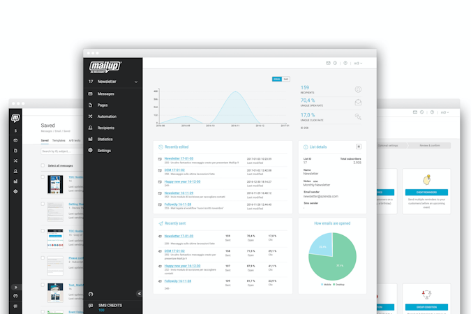 MailUp is an email and SMS delivery solution which enables users to send and design their own promotional, newsletters, transactional emails and SMS, and helps users to automate email & SMS marketing campaigns, with the ability to send millions of emails each month with no limits. With A/B testing, users can compare and analyze different email variations. Using SMTP+, users can send emails from a web application, an ecommerce store or from a mailbox.