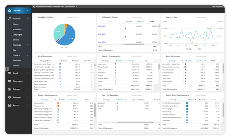 Marin Software boasts several AI-powered marketing solutions that empower marketers to save time and sell more. Link all your publisher accounts (Google, Facebook, Amazon, Tiktok, and dozens more), connect online and offline conversions, and let Marin's powerful AI solutions unify your data, identify cross-channel opportunities, automate optimizations, and adjust bids to achieve the targets you set.