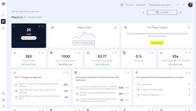 Mayze is a cloud-based business-to-business (B2B) marketing analytics software that aggregates data from websites, LinkedIn, search engine optimization (SEO), email, and leads.