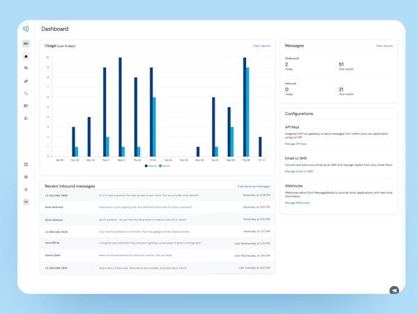 Using Sinch MessageMedia, you can easily send mass SMS campaigns and analyze engagement, or use the multichannel inbox to engage in one-to-one conversations over SMS, Messenger, Instagram, WhatsApp, and Google’s Business Messages.