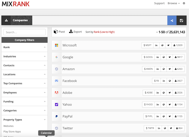 MixRank tracks over 25M Company Profiles on professional social networks, and covers key firmographic datapoints such as Company Domain, Description, SICs/NAICS codes, Ticker Symbols, Revenue, Employee Headcount (available as a time-series datapoint for 2+ years).