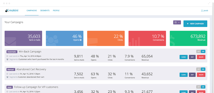 From the dashboard of Mokini, users have access to performance statistics such as number of emails sent, percentage of emails opened, click rates, conversions and business effectiveness. Statistics are then broken down into individual campaigns so that users can assess the success of each campaign and edit, clone or delete them accordingly.