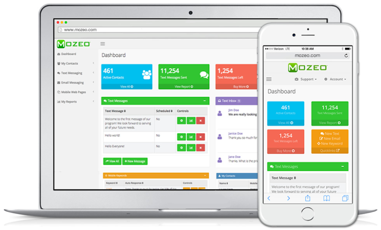Mozeo has been a leading authority for over a decade, helping thousands of customers create and execute a text messaging plan. Get access to a feature-loaded dashboard that includes contacts management, keyword autoresponders, SMS, MMS, text conversations, live chat, reports, and more. Best of all, our support is unmatched - we've had a 97% customer satisfaction rating for three years running.