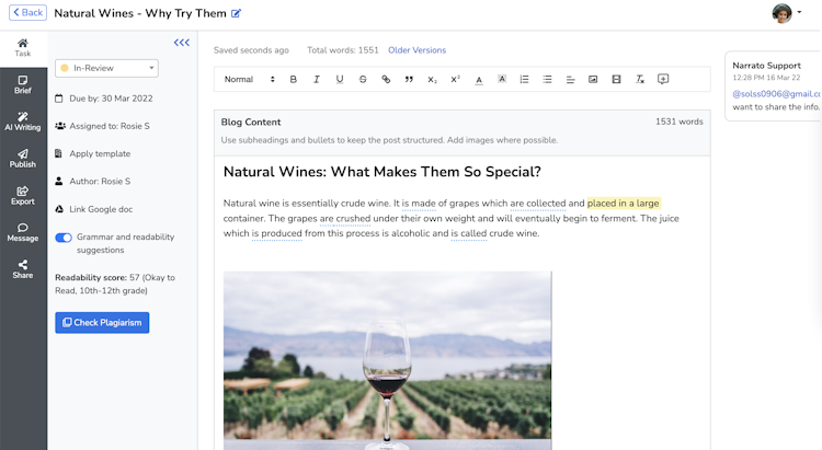 Narrato is a content creation, planning and workflow management platform. It assists users with content project management including tasks assignment, tracking, collaboration, content calendar management, workflow automation etc. The platform has an AI content assistant for AI writing, SEO content briefs, ideation, readability, and grammar optimization. Narrato replaces project management software, drives, emails, sheets, content creation, ideation, SEO and optimization software - and consolidates content creation and management - all in one place.