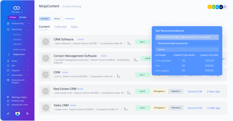 NinjaContent by 500apps is a content planner that helps users plan their content by scheduling and posting content on social media platforms for their growing business. The main USPs of NinjaContent are Built-in SEO Content Marketing, Planning, and managing an ultimate content marketing strategy that includes relevant keywords for a website and helps high search engine ranking organically.