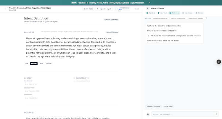 Pathmode is a product discovery software that transforms unstructured user feedback into execution-ready specifications for product teams and AI agents. Operating as an intent layer for product discovery, this platform bridges the gap between user experience friction points and engineering execution. Pathmode primarily serves product managers, designers, researchers, and engineering teams that translate messy feedback into actionable development tasks. The software is designed for organizations that have adopted AI assisted development workflows and face challenges in requirement definition and contextual understanding.