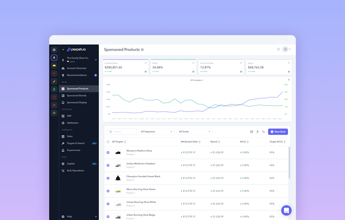 Perpetua’s artificial intelligence-powered bidding engine is designed to ensure that the most efficient bids are placed automatically on the keywords most likely to convert. Multiple campaigns can be structured according to Amazon’s best practices and strategic business objectives. Ad spend can be allocated to reach specific customer segments to increase return on ad spend, and users can view total and organic sales growth, blended advertising cost of sale (ACoS), and more with Perpetua’s advanced analytics.