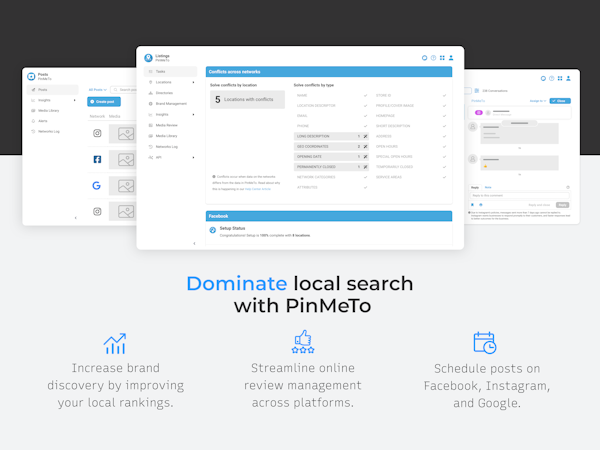 PinMeTo’s Listings tool ensures that your business information is consistent and accurate across more than 100 online platforms, including Google, Facebook, Apple Maps, and more.