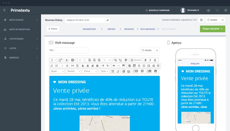 Primotexto is a French-language SMS communication and marketing solution. Users can launch campaigns, configure alerts and notifications. Primotexto provides behavioral monitoring, acknowledgement of receipt, support detection or link tracking.