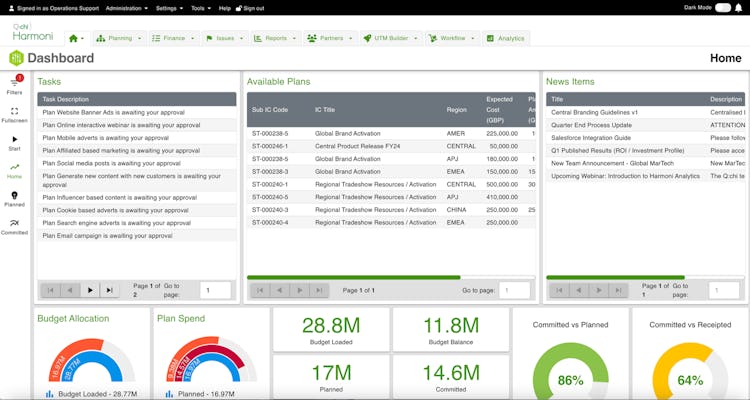 Q:chi Harmoni is a marketing operations automation platform designed for enterprise marketing teams seeking enhanced control and visibility. The solution enables organizations to run hierarchical marketing campaigns that align with corporate strategy while providing real-time budget management capabilities. Marketing departments can plan and control budgets with agility, prevent underspend, and respond to changing market conditions within an intuitive workspace environment.