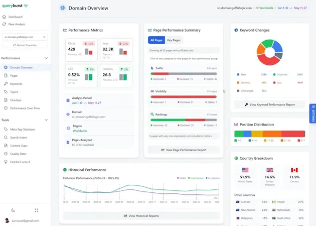 QueryBurst is a modern SEO analysis and auditing platform built directly on your verified Google Search Console data. It helps content-driven websites, SaaS companies, eCommerce stores, and digital marketers understand how their site is performing — and exactly how to improve it.