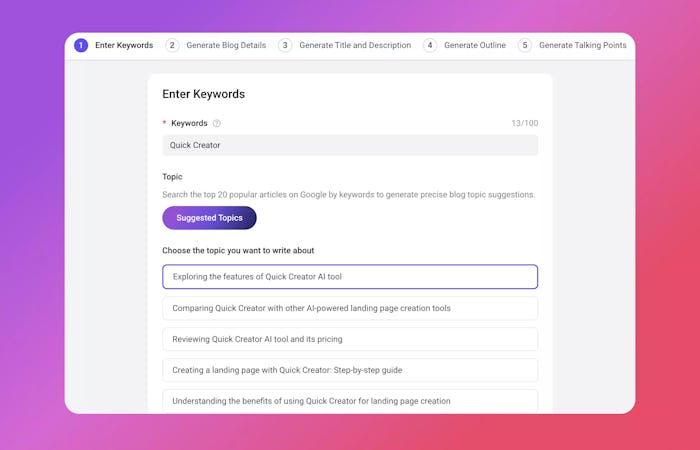 Quick Creator's blog builder allows users to pick prime keywords for content, select multiple languages, target countries, and regions, and auto-generate metadata like slugs, keywords, titles, and slugs. Teams can also utilize AI to analyze information collected from keywords, recommendations, and URLs and insert images and external/internal links into content. Marketers can also design multiple personalized landing pages for different target audiences with call-to-actions for improved conversion, brand awareness, and market segmentation.