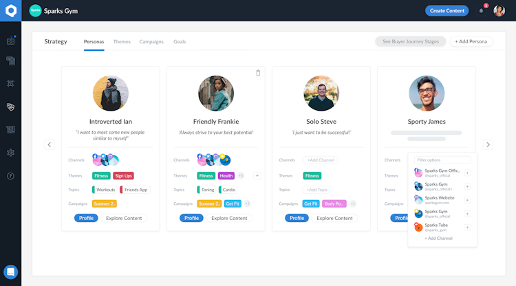 Quickly and easily tag buyer personas, set the buyer journey stage, add themes, topics, products, campaigns and goals.