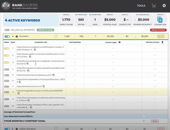 Rank Hacker is a content intelligence software designed to help businesses identify high-performing keywords for marketing campaigns and build SEO strategies based on predefined return-on-investment (ROI) projections. Using the SEO Goal Calculator tool, managers can forecast the total number of website visitors required to complete the defined sales goal each month.