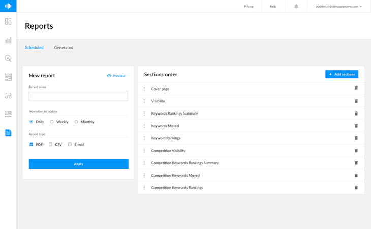 Ranktracker is a cloud-based SEO management software designed to help businesses monitor the performance of keywords and track website ranking across multiple search engines. Supervisors can use the dashboard to gain an overview of keyword visibility, traffic, and search engine positions through graphs and actionable analytics. Ranktracker provides organizations with a built-in keyword database, which can be utilized to search and find relevant keywords based on search volumes or ratings. Managers can analyze search engine results pages (SERPs) for specific regions and automatically score competitors’ links. It also lets users save researched keywords in specific lists for future reference. Ranktracker enables businesses to conduct an SEO audit of all webpages, identify potential issues, and generate XML reports. The software also helps users create SEO strategies and utilize the task lists to optimize webpages for search engines.