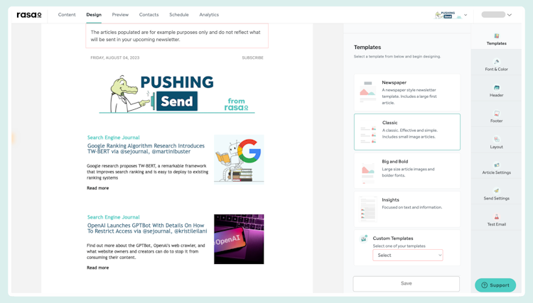Staff members can decide on the sources and the topic, and rasa.io takes care of the rest. With the help of AI, rasa.io collects and sorts through the articles produced by users' sources, selecting only the most relevant ones for the newsletter. The articles are then filtered and assigned to be sent to each subscriber based on their unique interests.