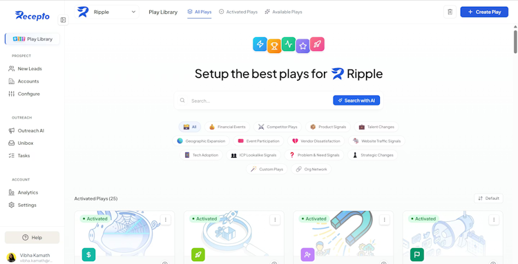 Recepto.ai is a prospecting and buyer intent detection platform designed to enable sales and go-to-market teams to identify and engage high-intent prospects through automated signal monitoring and outreach capabilities. The solution serves business-to-business sales organizations and revenue teams seeking to optimize prospecting efforts by surfacing prospects demonstrating active purchase intent. The platform applies artificial intelligence to monitor diverse data sources and detect relevant buying signals. This approach facilitates a shift from traditional outbound prospecting methods to an intent-first go-to-market strategy that emphasizes engagement at optimal moments in the buyer journey.