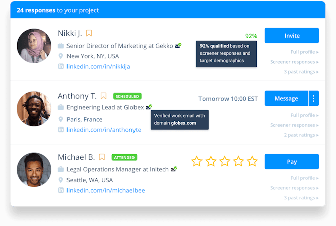 Respondent is a market and user research platform that enables UX, marketing, and product research teams to gain a deep understanding of any target audience. Businesses can create recruit professionals and consumers for any B2C and B2B research interview. All business professionals can be verified and qualified using LinkedIn integration and built-in screening tools.