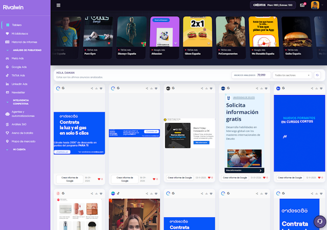 Rivalwin processes over one hundred fifty million advertisements in real time monitoring to analyze live advertising activity as it occurs. The system differentiates itself from static advertisement repositories by cross-referencing data across five platforms simultaneously, detecting strategic patterns, calculating estimated reach by audience segment and identifying which messages are repeated or scaled. The platform is optimized for Spanish and Latin American markets while supporting business to business applications as a specialized alternative to broader competitive intelligence tools focused primarily on search engine optimization or organic traffic analysis.