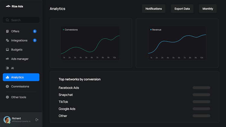 Affiliates become official contractors and gain exclusive access to Rize Ads' infrastructure, featuring a diverse suite of tools, advertising budgets, and comprehensive analytics: