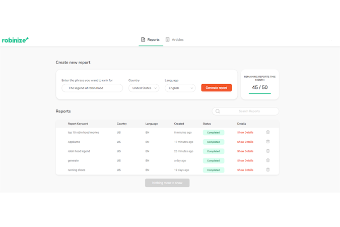 Robinize is an SEO-friendly content optimization tool you need to research, write, and optimize your content for SEO. By simply entering a phrase you want to rank for in Google, this tool will generate a report using the power of AI and give you all the tips and tweaks your content needs to reach Google's top positions.