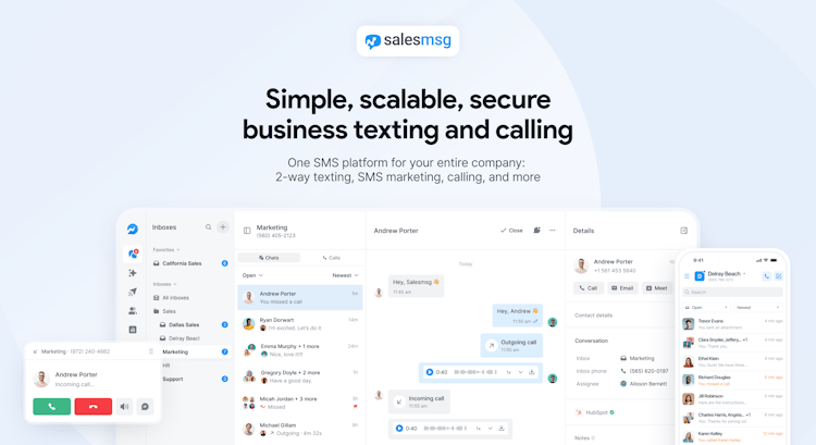 Salesmsg is scalable business texting software that allows users to send, receive and manage text messages conversations online. The platform enables two-way conversations between businesses and their leads, prospects, and other contacts.