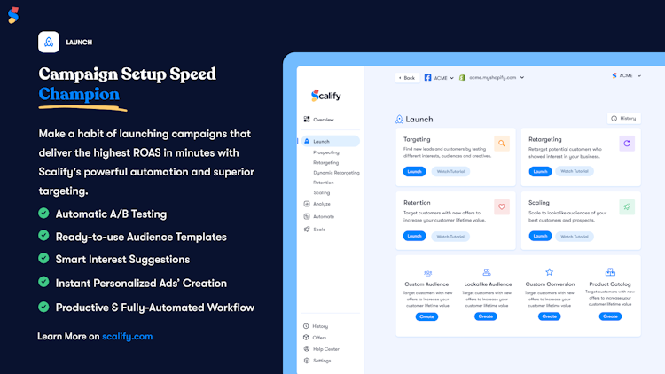Scalify is a marketing automation software that enables businesses to launch, analyze, optimize, and scale Facebook and Instagram ads faster with game-changing automation. Key features include AI ad copy, pre-built custom audiences, bulk scaling campaigns, quickstart strategies, and metric comparison. It also allows small businesses to launch successful ad campaigns using built-in templates, statistics, and insights from the data team.