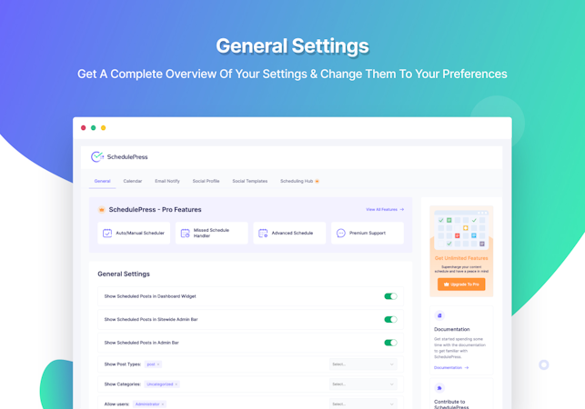 6. Full Control Over Scheduling Posts: Configure post types, categories, and user permissions.