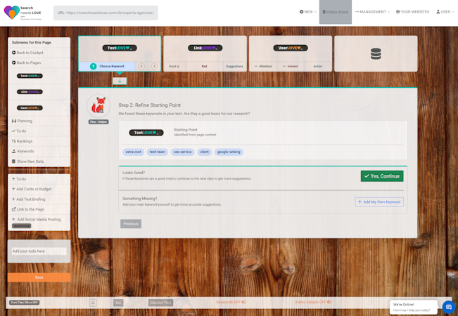 SearchneedsLOVE integrates with multiple data sources to maintain an up-to-date keyword repository and search volume metrics. It supports all major search engine domains worldwide and offers optimization in six languages: English, German, French, Spanish, Portuguese and others upon request. The user interface is available in four languages: English, German and partial support in French and Spanish. The platform delivers linkbuilding suggestions based on backlink profiles and competitor analysis. It identifies recovery steps for sites affected by penalties and adapts recommendations to align with algorithm updates.