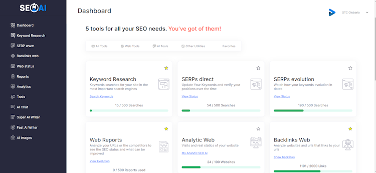 The SEO tools provide in-depth insights and actionable recommendations to enhance website performance. The Reports Web feature generates detailed reports on various aspects of website health, including page speed, content quality, and technical SEO. The Keyword Search tool empowers users to identify and analyze the most relevant keywords for their business, while the Current SERP and SERP Evolution modules enable them to monitor and track changes in search engine results page rankings over time. The Backlinks and Authority www tools offer comprehensive analysis of a website's backlink profile and domain authority, respectively, allowing users to identify opportunities for improvement.