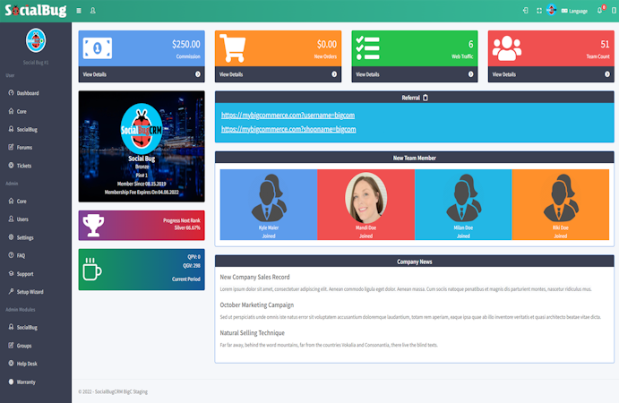 SocialBugCRM is a cloud-based MLM platform that helps manage multi-level marketing operations for online businesses. The platform offers custom workflows to create recurring memberships, manage auto-ships, and implement customer reward and retention programs. Additionally, it provides various features such as affiliate management, forums, help desk ticketing, and warranty tracking. The platform also integrates with various eCommerce applications and payment gateways such as WooCommerce, Coinbase Commerce, PrestaShop, Stripe, PayPal, and more.