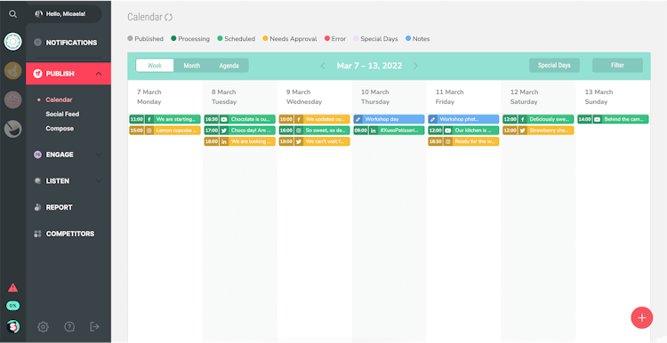 Manage social media content publishing and scheduling with automated ease on one collaborative dashboard. Visually organize and manage content calendars with content preview, social feed, weekly, monthly, and agenda views. Keep team collaboration consistent with advanced access settings.