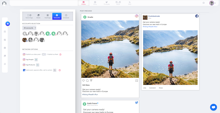 Upload your media (photos and videos up to 250Mo/file), type your text, select popular hashtags, check out the live preview, and schedule your posts in minutes.
