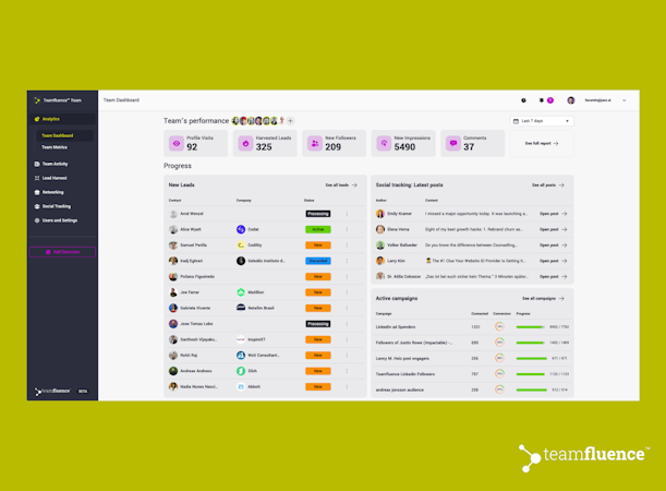 Teamfluence is a tool that turns LinkedIn engagement into qualified leads by capturing every profile view, post reaction, comment, and new connection across the entire team. All interactions are consolidated in a single, filterable Lead Harvest list.