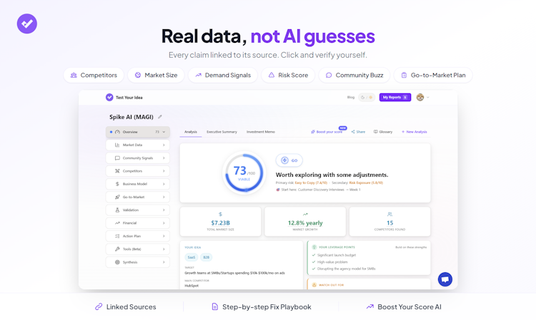 A proprietary scoring mechanism evaluates ideas on a one hundred point scale and provides detailed breakdowns of risk factors such as ease of replication and market exposure. Additional analytical components include weak spot scoring, competitor intelligence, market reality assessment with total addressable market and realistic customer base evaluation, real time search trend analysis and an actionable playbook that outlines steps to address each identified issue. The platform ensures that all findings are backed by verifiable evidence rather than algorithmic conjecture.