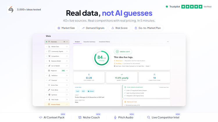 The platform operates through a three-step validation process that begins when an idea is submitted in plain text format without the need for a formal business plan or pitch deck. Once submitted, AI agents scan over forty live data sources, including competitor databases, market research repositories, community forums, news outlets, and product directories, to gather real-time intelligence. The system generates a viability score ranging from zero to one hundred, accompanied by a verdict that categorizes market potential. The free tier provides a basic viability assessment, key risk factors, market size estimation, and previews of two competitors, with a limit of two scans per user. The paid Founder Report tier expands the analysis to include detailed profiles of up to fifteen competitors with pricing structures, funding information, user counts, strengths, weaknesses, and exploitable market gaps. This tier also delivers a go-to-market plan with positioning recommendations, channel strategies, and launch priorities, along with three data-driven pivot suggestions designed to improve market fit.
