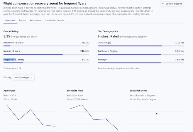 AI personas within the environment operate with four layers of memory covering product interactions, social connections, world events and reflective learning. This structure enables personas to maintain context across multiple survey interactions and simulate realistic behavioral patterns. The platform provides thematic analysis capabilities that identify key drivers and barriers within feedback data, segment responses by demographic characteristics and generate comprehensive reports containing quantitative metrics and qualitative insights. Visualization tools map social networks and persona clusters with force directed graph layouts to illustrate how opinions propagate through simulated structures. Users can export datasets and reports for further analysis or presentation.