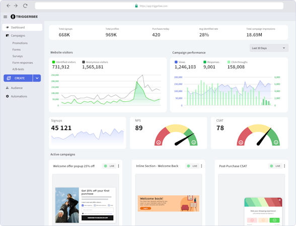 • Target specific audiences and individuals with Onsite Campaigns (popups, embedded forms, banners, callouts) on your website, based on web activity or customer data.