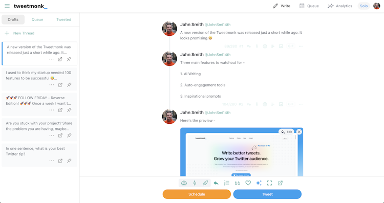 Tweetmonk is an intuitive, social media management platform for Twitter Users with the ability to create rich media content using AI models and schedule tweets and threads, in order to increase engagement and grow their Twitter Account more strongly.