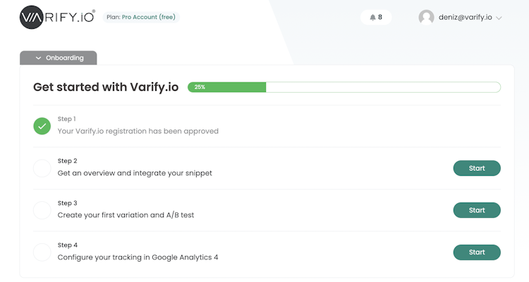 Also, within Varify.io you can test your landing page variations directly with our A/B-Test functionality. There is no limit of landing pages or any traffic limit. That´s why Varify.io is a cost effective alternative to Google Optimize.