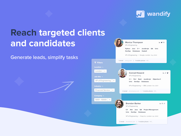 Wandify is a versatile SaaS platform offering a comprehensive database for lead generation across businesses of all sizes. It's a valuable asset for sales, marketing, and recruitment teams, providing essential contact details for effective lead generation. Recruiters benefit from accessing contacts, strengthening connections.